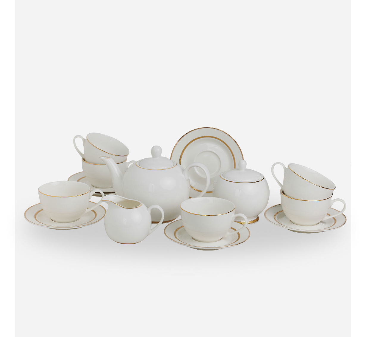 Чашка 6 штук - 220 мл, Блюдце 6 штук - диаметр 15,5 см, чайник 1000мл, сахарница - 500мл, молочник - 200мл. Коллекция Aristo Gold с золотым ободком, материал 100% фарфор